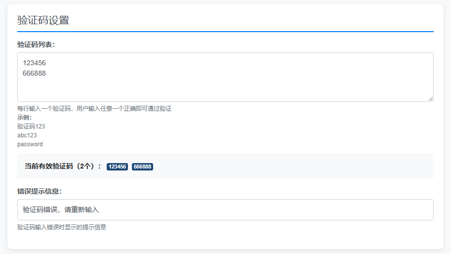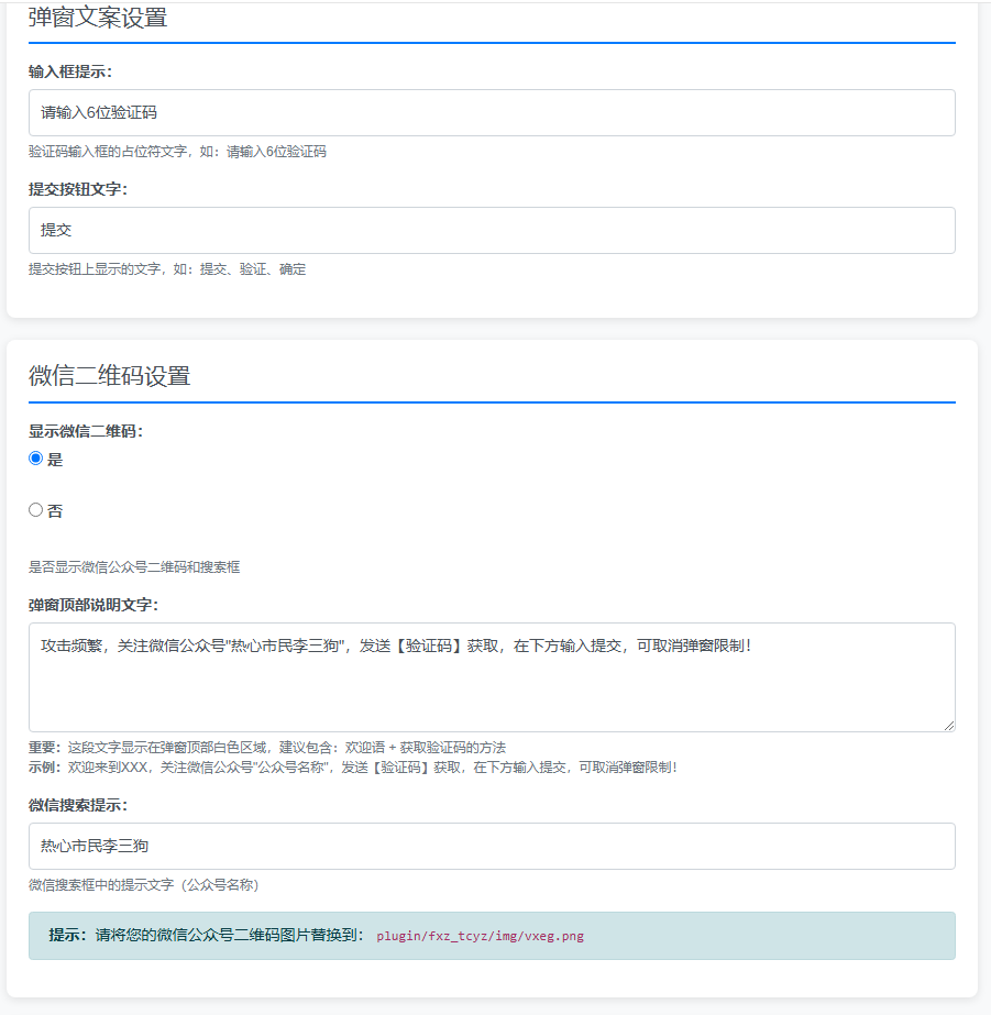 全站弹窗验证码插件,支持自定义多个验证码,验证通过后才能访问网站。支持微信二维码展示和备用地址设置。