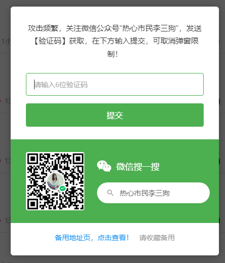 全站弹窗验证码插件,支持自定义多个验证码,验证通过后才能访问网站。支持微信二维码展示和备用地址设置。